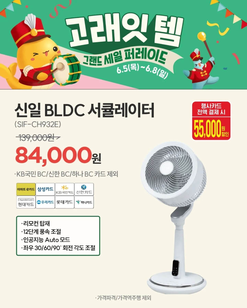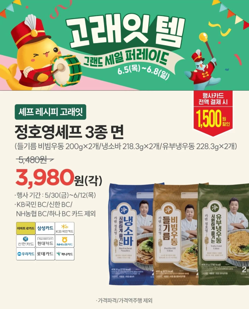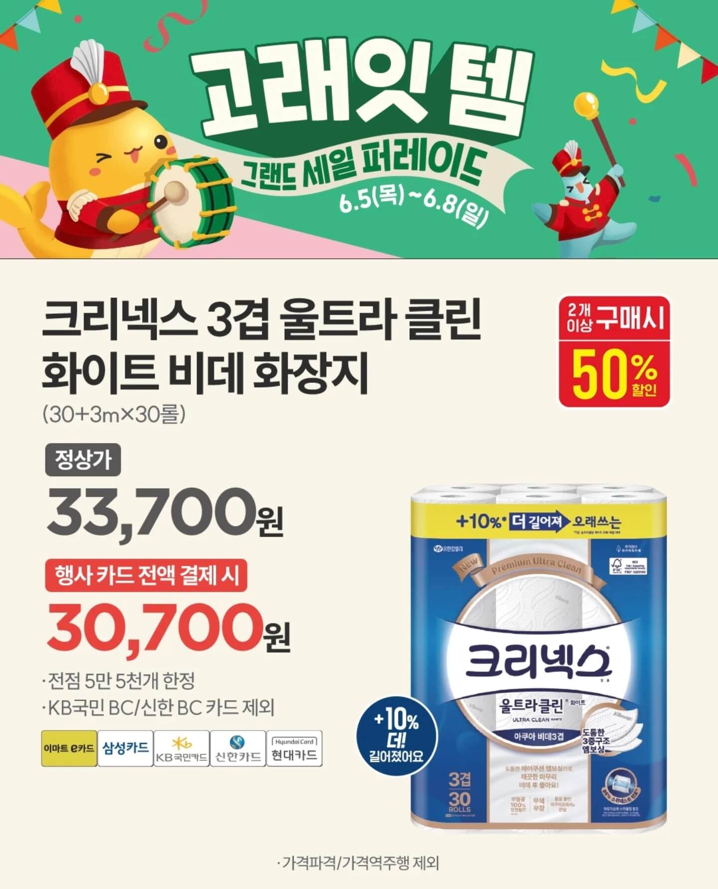 이마트 고래잇 페스타 6월 세일 품목을 구매할 때도 행사카드는 필수로 챙겨야 한다. 행사카드로는 이마트 e카드, 삼성, KB 국민, 신한, 현대, NH농협, 우리, 롯데, 하나카드이며 KB국민 BC와 신한 BC, NH농협 BC, 하나 BC카드는 제외되니 참고하자.