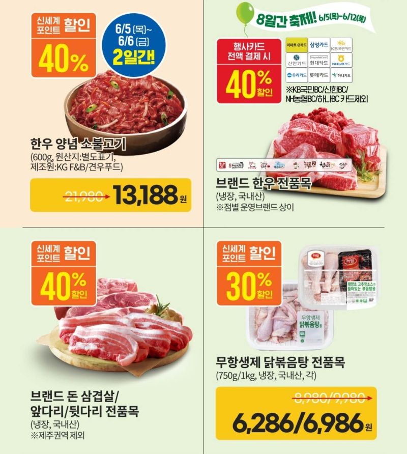 이번 이마트 고래잇 페스타 6월 전단지 세일 품목에서는 육육 위크도 빼놓을 수 없다. 한우 등심 1/1+ 등급을 행사카드로 전액 결제하면 50% 할인된 반값으로 구매할 수 있고, 미국산 프라임등급 소고기 전품목도 행사카드 결제시 최대 50% 할인가로 구매할수 있으며 브랜드 한우 전품목을 40% 할인된 가격에 선보인다.