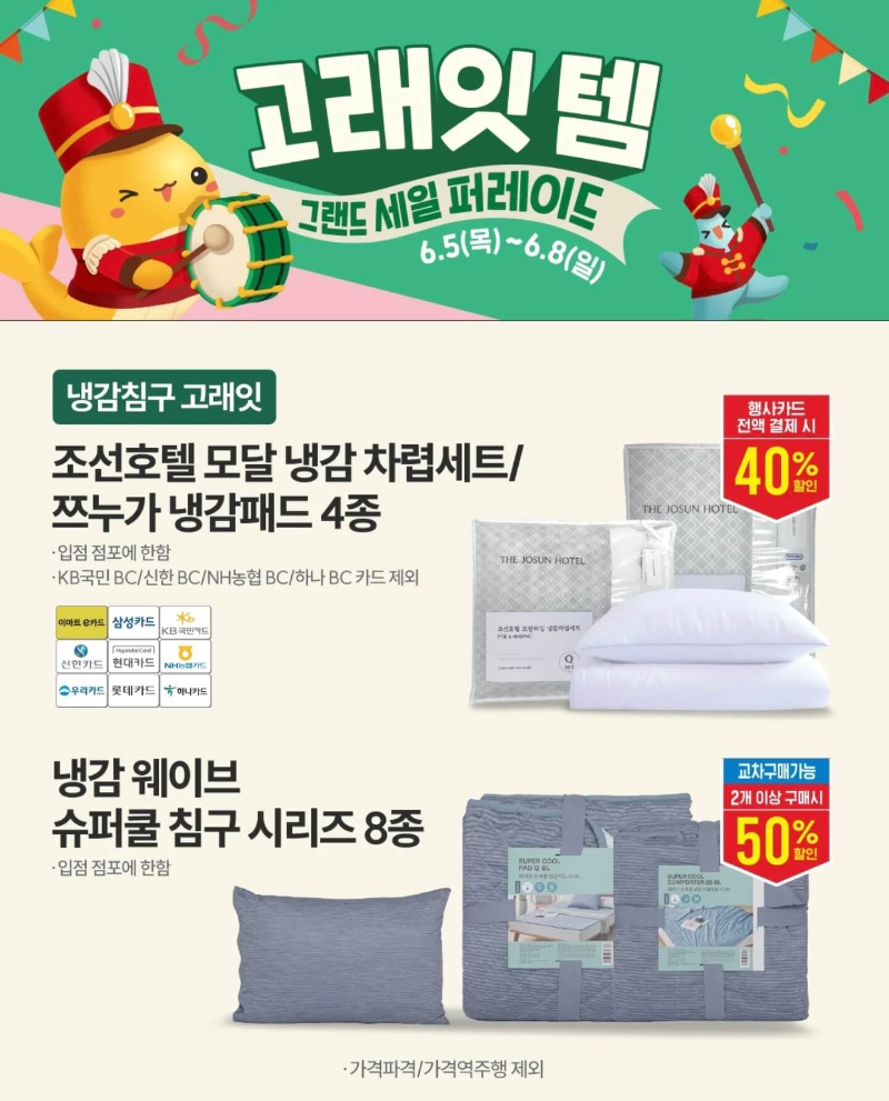 무더운 여름을 앞두고 냉감침구와 냉방 가전도 고래잇템으로 준비되어 있다. 심지어 냉감 차렵세트는 조선호텔 모달 냉감 차렵세트이고 여기에 쯔누가 냉감패드 4종을 행사카드로 결제사면 40% 할인된 가격으로 구매할 수 있다. 또, 냉감 웨이브 슈퍼쿨 침구 시리즈 8종은 2개 이상 구매시 50% 할인 된 가격에 구매할수 있다.