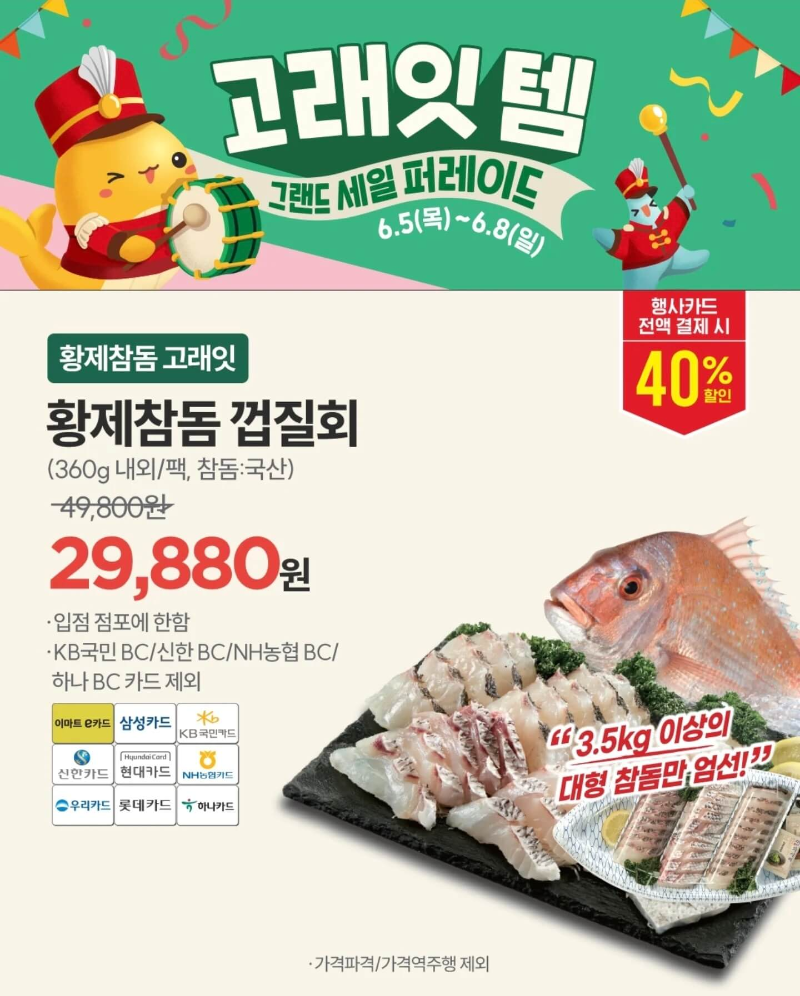 이마트 고래잇 페스타 6월 전단지 세일 품목들을 살펴보면 매번 그래왔던 것처럼 다양한 상품들을 할인 판매한다. 이번 6월 세일 페스타에서도 30년 이상의 노하우를 총동원해 만든 고래잇템도 풍성하게 준비했는데 3.5kg 이상 대형 참돔만 엄선하여 만든 황제 참돔 껍질회를 행사카드로 결제 시 40% 할인된 가격으로 선보인다.