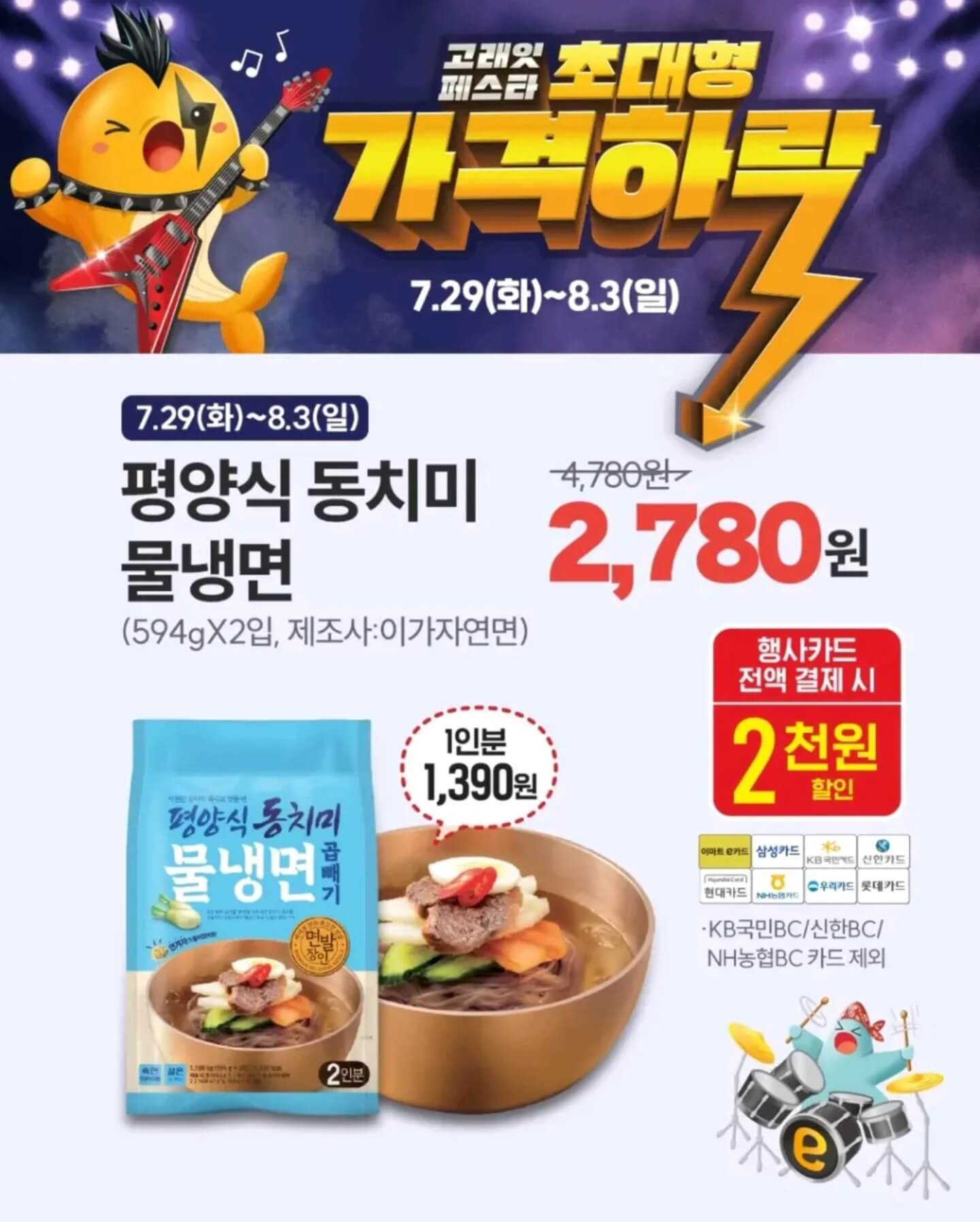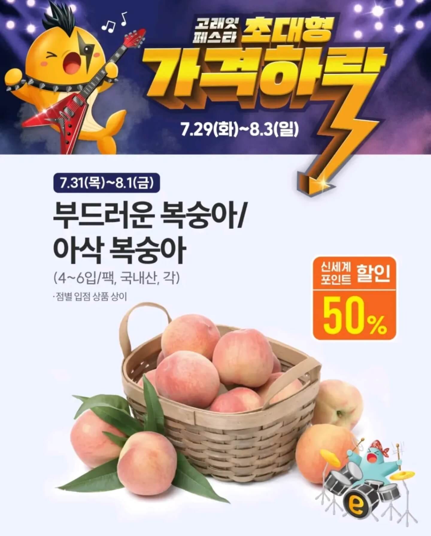 이마트 8월 고래잇 페스타는 7월 29일(화)부터 8월 3일(일)까지 6일간 진행되며 해당 행사는 각 점포별로 입점 상품을 기준으로 진행된다. 무엇보다 이번 고래잇 페스타는 초대형 가격 하락이라는 슬로건 아래 휴가철 수요가 높은 신선식품부터 가공식품, 생활용품, 가전 등 대부분의 제품을 릴레이 형태로 할인한다.