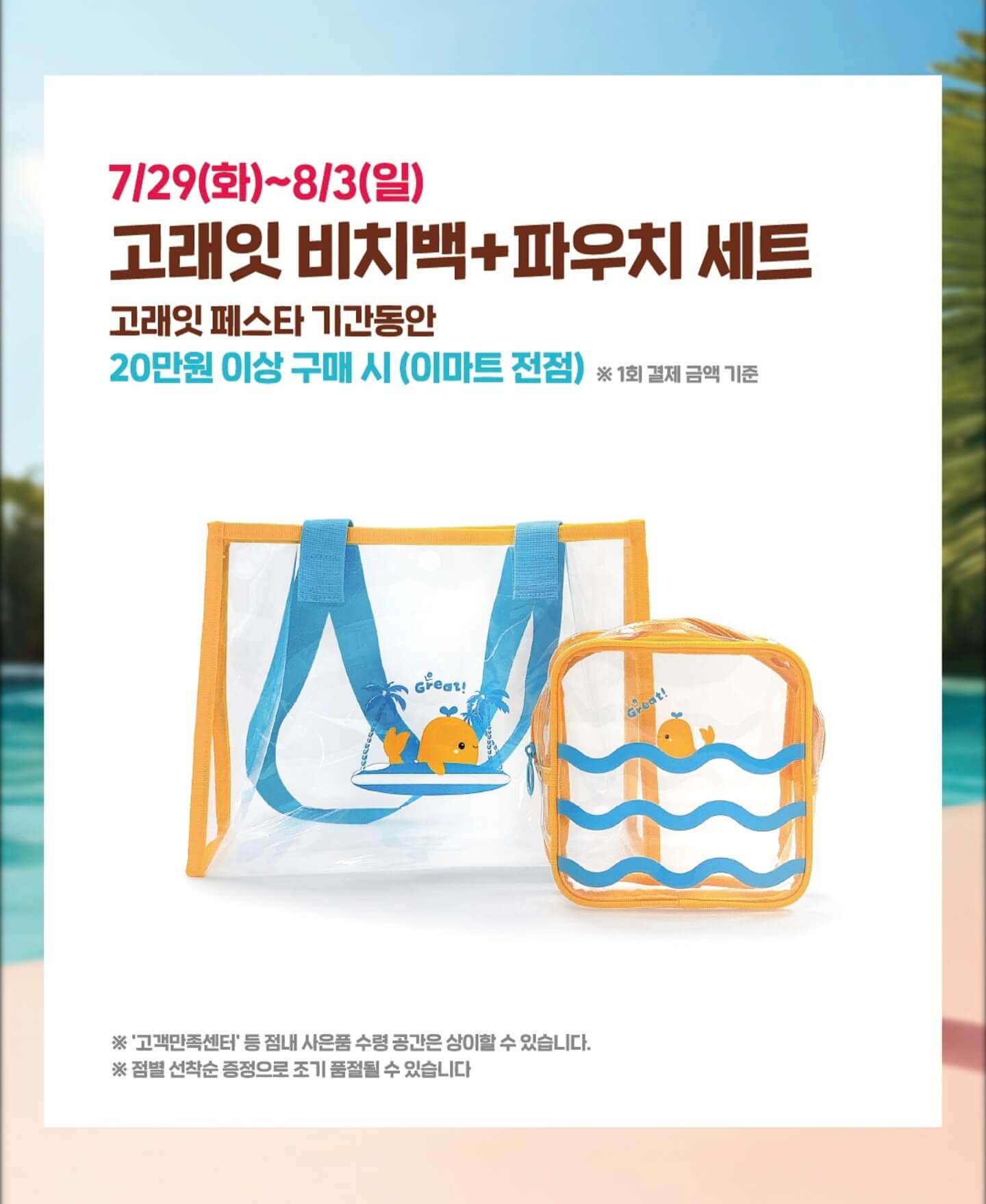 그리고 이번 8월 고래잇 페스타 기간동안에 20만 원 이상 구매 시 고래잇 비치백과 파우치를 증정하는데 이는 고객만족센터에서 수령할 수 있으며 선착순 증정이라서 조기 품절될 수 있으니 참고하자.