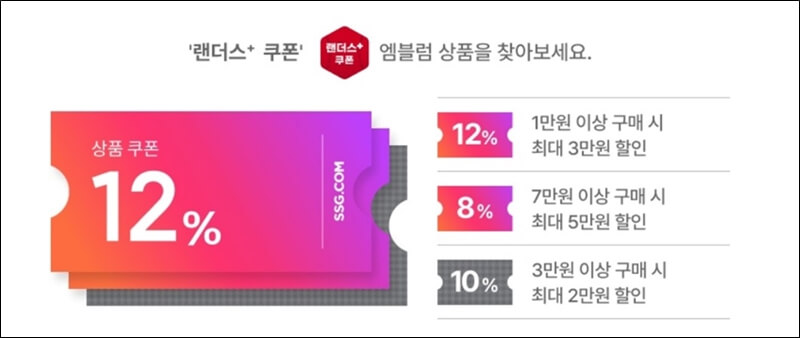 그리고 또하나! 이마트 랜더스데이 더블쿠폰 외에도 신세계그룹에서 사용할 수 있는 랜더스 3종 쿠폰도 증정하는데 12%, 8%, 10% 3장의 쿠폰을 두 장씩 받을 수 있으니까 잊지 말고 꼭! 챙기도록 하자.