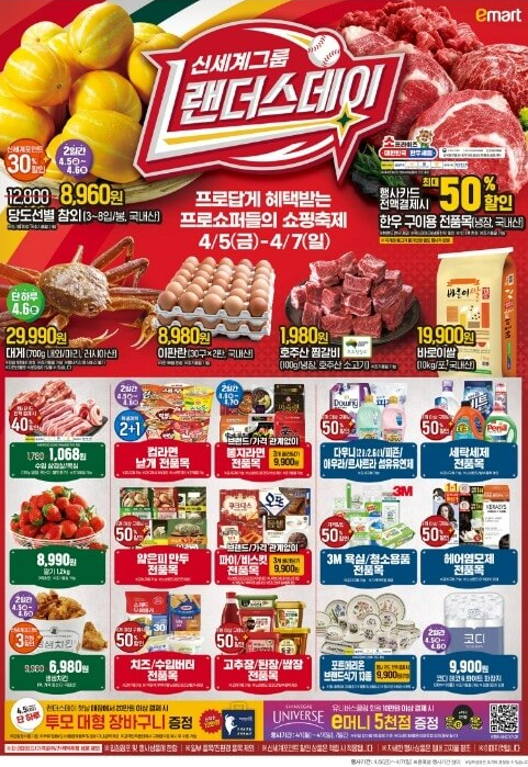 이마트 랜더스데이 전단지를 살펴보면 한우 구이용 전품목을 행사카드로 전액결제시 최대 50% 할인받아 구매할 수 있고 30구짜리 계란은 2판에 8,980원에 구매할 수 있다. 그리고 4월 6일인 토요일에는 700g 내외 대게를 29,990원에 구매할 수 있으니 대게 또는 소고기를 구매하려고 마음먹으신 분들은 토요일 아침 일찍 오픈런해야 할 것 같다.