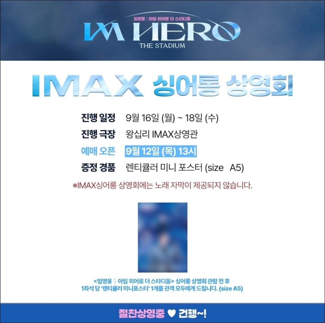임영웅 영화 아임 히어로 더 스타디움이 개봉 3주 차를 맞이하여 앵콜 영시봉 상영회를 진행하고, 추석 연휴에는 싱어롱 위크를 진행한다고 해서 임영웅 영화 싱어롱 예매 오픈 일정에 대해 정리해보려고 한다.