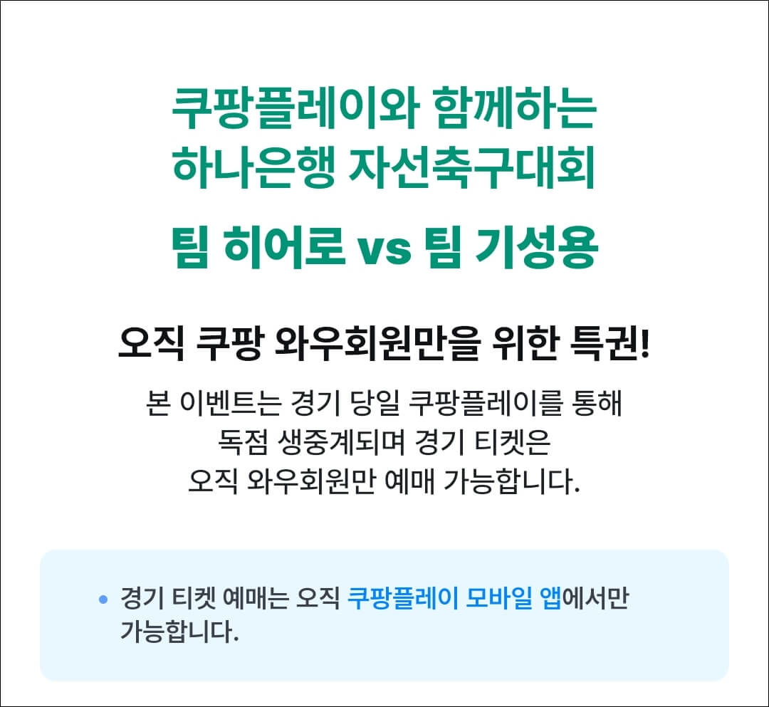 일단, 임영웅 자선축구 티켓 예매는 9월 20일 오후 8시에 오픈되는데 중요한건 쿠팡 플레이 앱에서만 티켓 예매를 할 수 있다는 것이다. 그리고 티켓팅뿐만 아니라 중계 방송까지 쿠팡 플레이에서 독점으로 생중계되는데 이 혜택은 오직 쿠팡 와우 회원들에게만 제공된다.