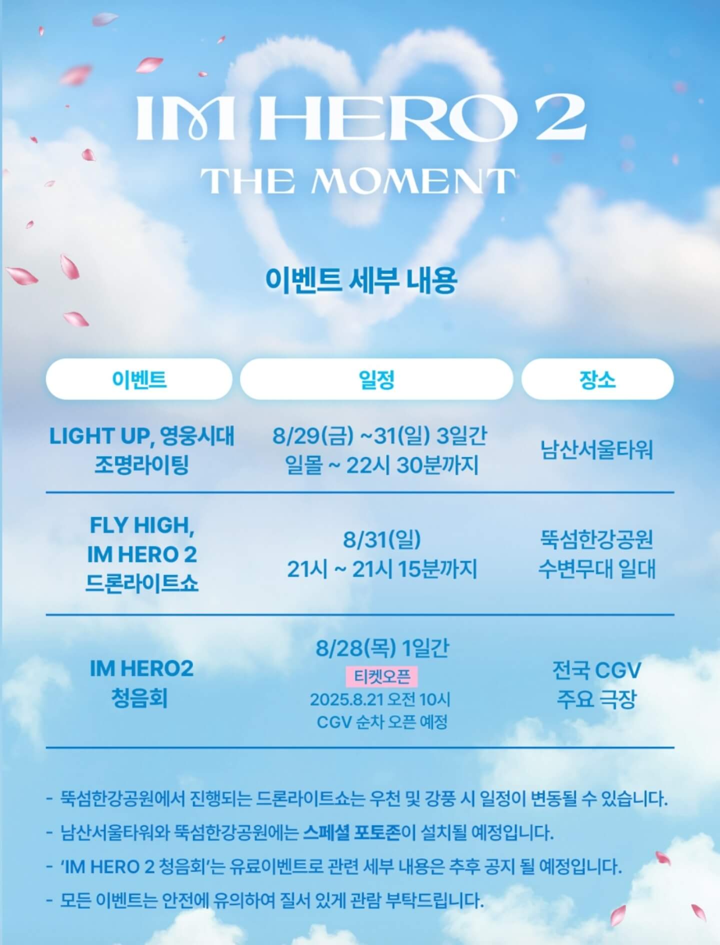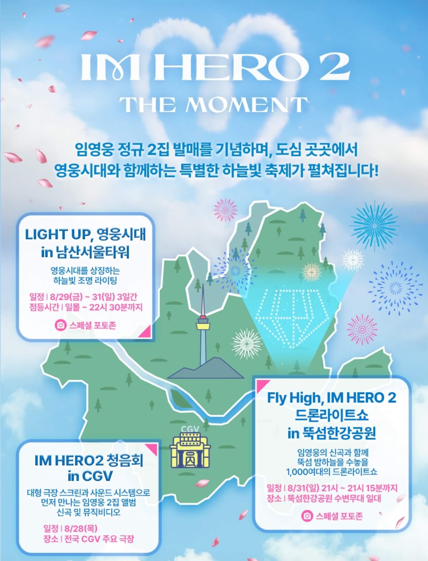 임영웅 청음회 예매는 8월 21일(목) 예매 오픈 시 CGV앱에 미리 로그인 및 알림설정, 결제수단을 미리 준비해 놓는 것이 필수이고, 하늘빛 축제는 낮에는 남산 포토존, 밤에는 뚝섬 드론쇼 코스로 돌아보는 것을 추천한다.