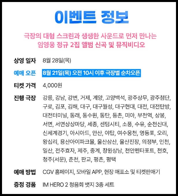 임영웅 청음회 예매가 진행되는 극장은 강릉, 강남, 강변, 거제, 계양, 고양백석, 광주상무, 광주첨단, 구로, 김포, 김해, 대구, 대구월성, 대구현대, 대전, 대전탄방, 대전터미널, 동래, 동수원, 동탄, 등촌, 미아, 부천역, 상봉, 서면, 서면상상마당, 세종, 센텀시티, 소풍, 수유, 순천신대, 신세계경기, 아시아드, 안산, 야탑, 여수웅천, 영등포, 오리, 왕십리, 용산아이파크몰, 울산삼산, 울산진장, 의정부, 인천, 일산, 전주효자, 제주, 중계, 창원상남, 천안펜타포트, 천호, 청주(서문), 춘천, 판교, 평촌, 평택 CGV에서 진행하고, CGV 홈페이지와 모자일 앱 그리고 현장 매표소 및 티켓 판매기에서 예매가 가능하다.