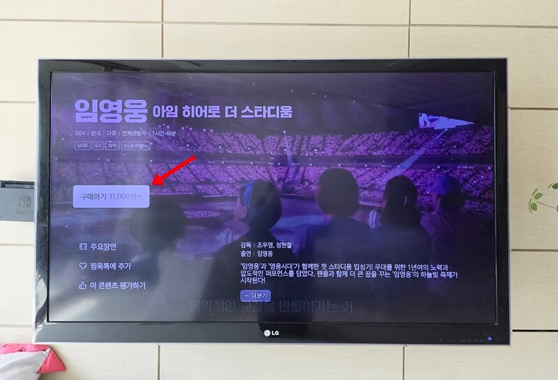 만약 메인화면에 보이지 않는다면 vod 목록에서 임영웅 콘서트 영화를 찾아서 리모콘에있는 확인 또는 OK버튼을 눌러준다.