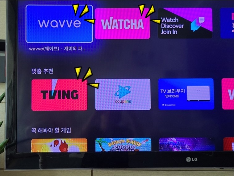 맞춤 추천에서 OTT 앱을 찾거나 구글 플레이로 들어가서 OTT앱을 찾아 tv에 설치하면 된다.