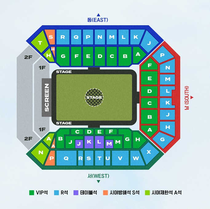 서울 상암 월드컵 경기장은 이런식으로 되어있다. 아직 콘서트 티켓이 오픈되지 않았다 보니 정확한 좌석배치도가 나오진 않았으나 중심을 무대라고 생각하고 예약해야 할 좌석을 생각하는데 참고하면 좋을 것 같다. 임영웅 상암 콘서트 좌석배치도가 공개되었다. 본 공연은 야외 공연으로 그라운드를 포함한 동/서/남/북 다방면을 무대로 활용하기때문에 일부 시야 방해가 발생될수도 있다. 그렇기에 꼭 시야방해석을 숙지하고 예약해야한다. 사실 지금까지 임영웅 콘서트 무대들을 보면 어느 자리에 앉더라도 잘 보일 수 있게 배치하기도 하고, 곳곳에 고화질의 전광판을 설치하기 때문에 좌석이 중요한 게 아닌 그냥 콘서트 자체에 갈 수 있다는 것만 생각하고 예매하면 될 것 같다.