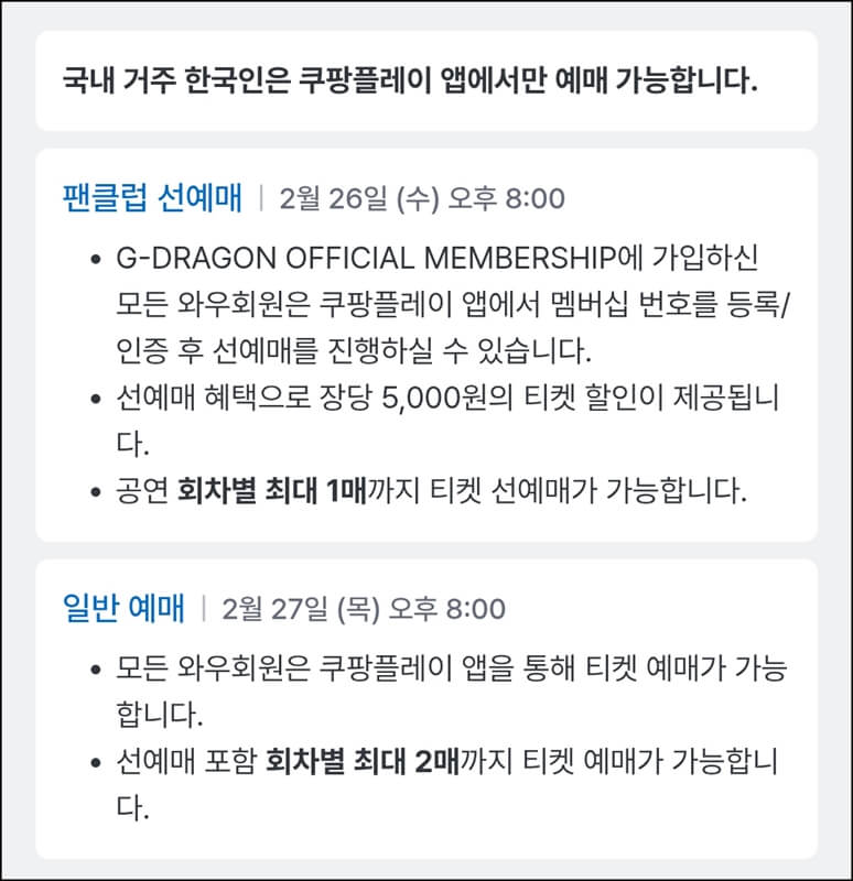국내에 거주하는 한국인이라면 쿠팡플레이 앱에서만 예매가 가능한 지드래곤 콘서트는 팬클럽 선예매와 일반예매로 나눠지며 티켓이 오픈되는 날짜 또한 달라진다.