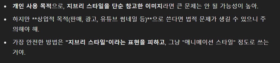 '지브리 캐릭터를 그대로 그리는 건 저작권 침해가 될수있지만 단순히 지브리 감성이나 지브리 스타일처럼 화풍이나 분위기만 참고해서 그리는건 문제가 되지 않고, 또, 블로그나 개인 SNS에 올리는 건 일반적으로 괜찮지만 상업적 목적으로 사용한다면 법적 문제가 생길 수도 있으니 주의. 만약 챗지피티 지브리 스타일이 저작권 문제로 찜찜하다면 지브리 스타일이라는 표현보다는 애니메이션 스타일 정도로 쓰는 게 안전'