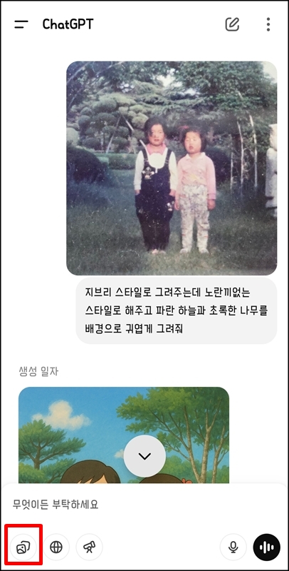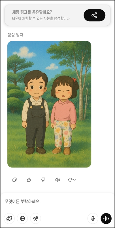 나는 어릴 때 여동생과 함께 찍은 사진을 불러온 뒤 '지브리 스타일로 그려주는데 노란끼 없는 스타일로 해주고 파란 하늘과 초록한 나무를 배경으로 귀엽게 그려줘'라고 요청을 했더니 왼쪽의 인물을 남자아이로 변환해 줬다. 단 한번에 요구사항이 맞아 떨어지기도 하지만 가끔 이렇게 오류가 나기도 하는데 그럴때는 수정요청을 하면 된다.