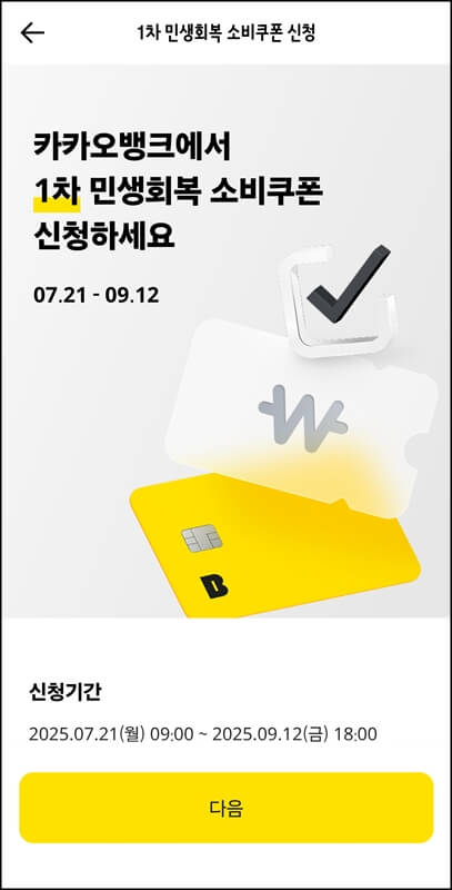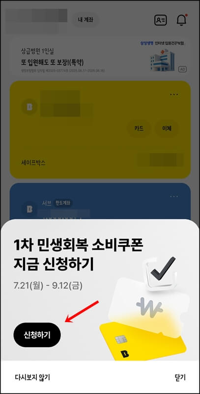 카카오뱅크 민생지원금 신청을 하려면 카카오뱅크로 만든 계좌 즉, 체크카드가 있어야 하고, 카카오뱅크 앱에 접속하면 민생지원금 신청 팝업이 큼지막하게 뜨니까 해당 팝업을 누르고 바로 신청하면 된다.