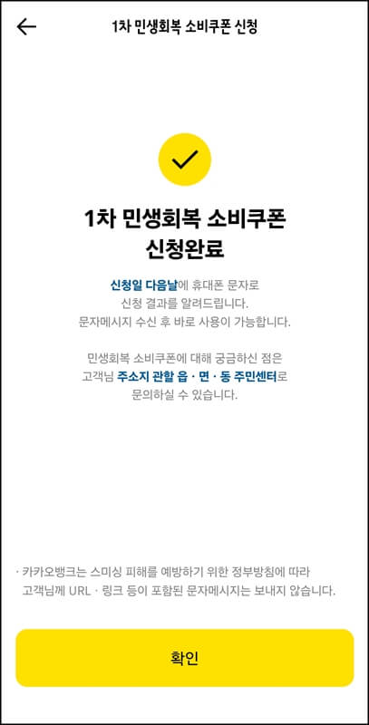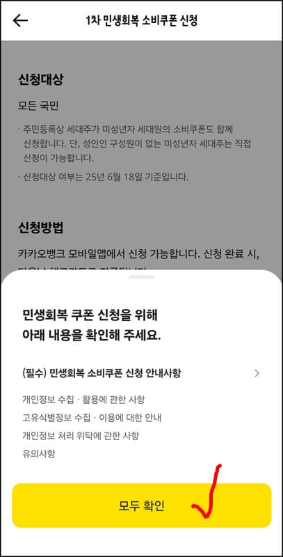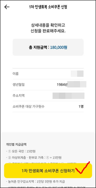 카카오뱅크 민생지원금 신청 페이지에서 안내하는 사항들을 읽어보고 모두 확인을 클릭한 뒤 금액과 본인의 이름 및 생년월일, 주소 지역 등을 확인하고, 1차 민생회복 소비쿠폰 신청하기 버튼을 한번 더 클릭한다.