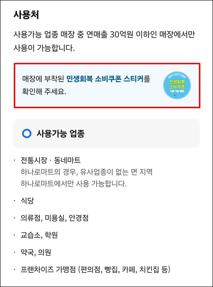 민생지원금은 본인의 주소지 내에서만 사용해야 한다는 건 다들 알고 있을 것이다. 연매출 30억 원 이하인 매장에서만 사용이 가능하며 대부분 지역화폐 사용이 가능했던 가능점에서 사용이 가능한데 매장 내에 부착된 민생회복 소비쿠폰 스티커를 보고 사용하면 된다.