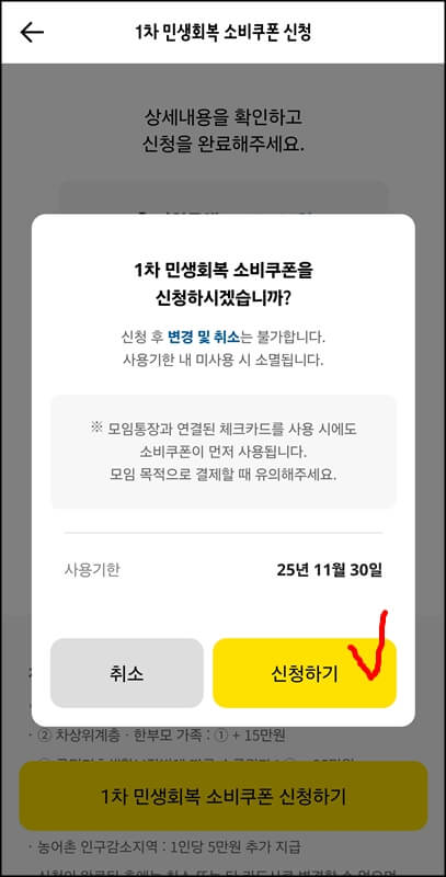 카카오뱅크 민생지원금 신청을 하고나면 변경 및 취소가 불가하고, 모임통장과 연결된 체크카드를 사용해도 소비쿠폰이 먼저 사용하기 때문에 모임 목적으로 결제할 때 유의하라는 안내사항을 확인 후 신청하기 버튼을 누르면 소비쿠폰 신청이 완료된다.