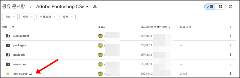 포토샵 cs6 무료다운 배너로 접속했다면 위와 같은 구글 드라이브 공유 문서함으로 이동될것이다. 그럼 가장 아래에 있는 Set-up.exe를 클릭하고,