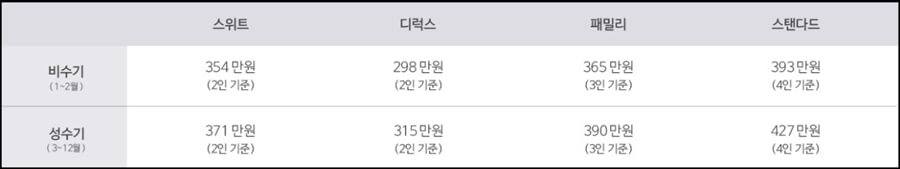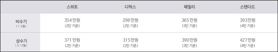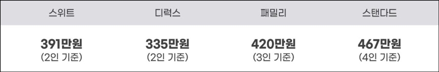 추석코스는 스위트 391만 원, 디럭스 335만 원, 패밀리 420만 원, 스탠다드 467만 원으로 형성되어 있고, 10월 3일, 7일, 10일에 출발하는 스케줄이다.