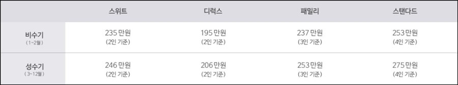 전국일주 2박 3일 기준의 해랑열차 객실별 가격이다. 비수기와 성수기에 따라서 가격차이가 발생한다.