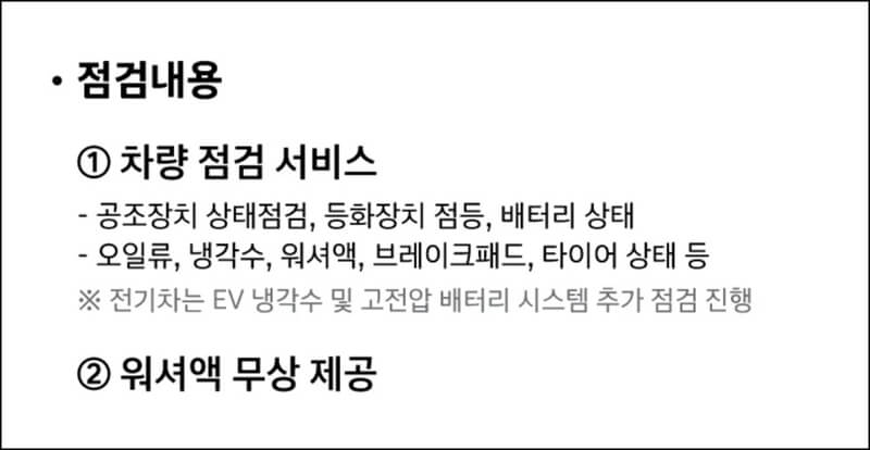 이번 현대 자동차 무상점검 서비스는 공조장치 상태점검과 등화장치 점등, 배터리 상태, 오일류, 냉각수, 워셔액, 브레이크패드, 타이어 상태 등을 점검하고 전기차는 EV 냉각수 및 고전압 배터리 시스템을 추가적으로 점검해 준다. 여기에 워셔액도 무상으로 제공된다.