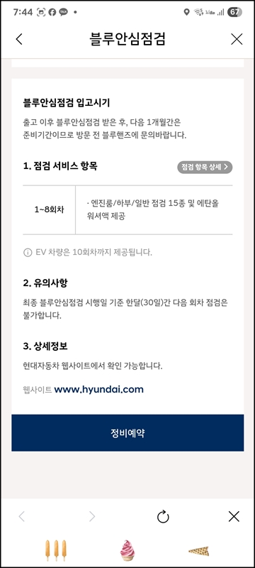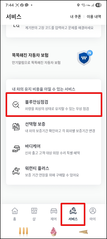 그럴 때는 하단에 있는 서비스를 누르고, 블루 안심점검으로 들어가서 현재 내 차량의 안심점검 서비스를 무상점검으로 받을 수 있는지 확인해 보는 것도 좋을 것 같다. 블루안심점검 또한 무상으로 진행되는 점검서비스로 점검 회차에 따라서 점검 항목만 달라지고, 워셔액 또한 제공되니 참고하자.