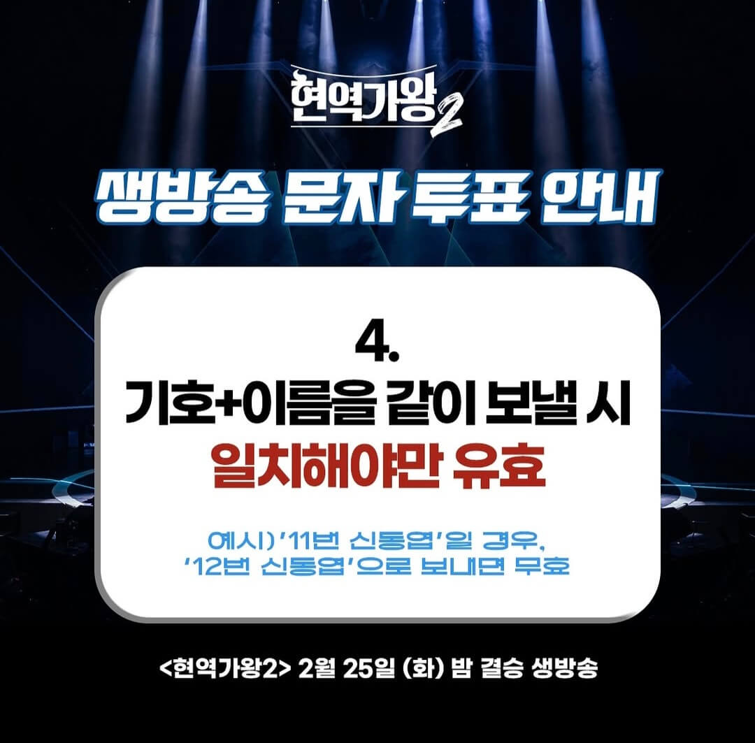 앞서 얘기했듯이 고유번호 + 가수이름이 정확하게 일치해야해서 만약 8번 에녹으로 보내면 무효처리되니까 에녹 또는 9번으로 보내야 하니 주의하도록 하자.