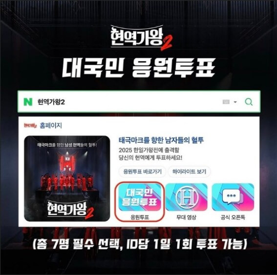 작년 이맘때쯤에 현역가왕 투표를 독려하는 포스팅을 했던 것 같은데 벌써 현역가왕2 투표하기가 시작되었다. 이번 시즌은 남자 편으로 여자 편과 마찬가지로 내년에 있을 한일가왕전에 출격할 TOP7을 선발하는 과정인데 내가 응원하는 가수에게 하루에 3번 현역가왕2 투표하기 가능한 방법을 공유해볼까 한다.