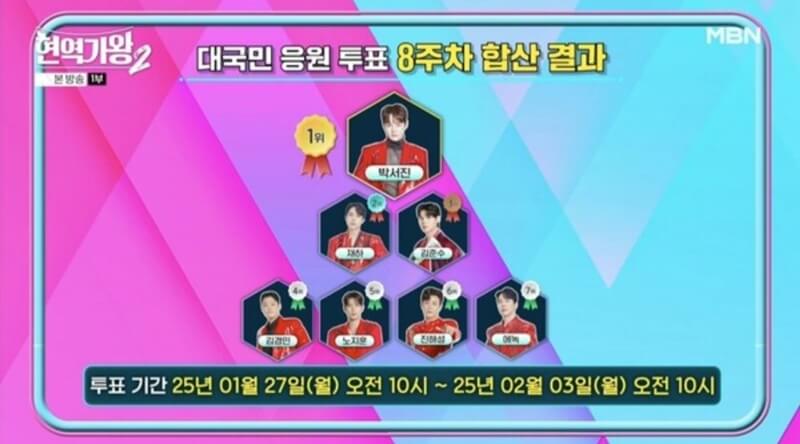 1월 27일(월) 오전 10시부터 2월 3일(월) 오전 10시까지 진행되었던 8주 차 대국민 응원투표에서는 역시나 박서진이 1위를 차지했고, 2위 재하, 3위 김준수, 4위 김경민, 5위 노지훈, 6위 진해성, 7위 에녹이 이름을 올렸다. 진해성은 꽤 오랜만에 응원투표 순위에 랭킹 된 듯~