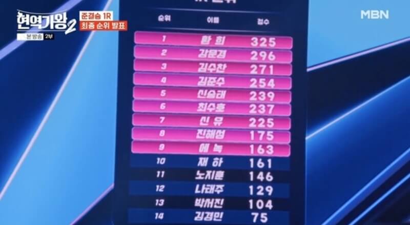 앞서 말했듯이 현역가왕 준결승 1라운드 1대 1 장르대첩은 400점이 걸려있었다. 여기서 환희가 325점, 강문경 296점, 김수찬 271점, 김준수 254점, 신승태 239점, 최수호 237점, 신유 225점, 진해성 175점, 에녹 163점, 재하 161점, 노지훈 146점, 나태주 129점, 박서진 104점, 김경민이 75점을 받았다.