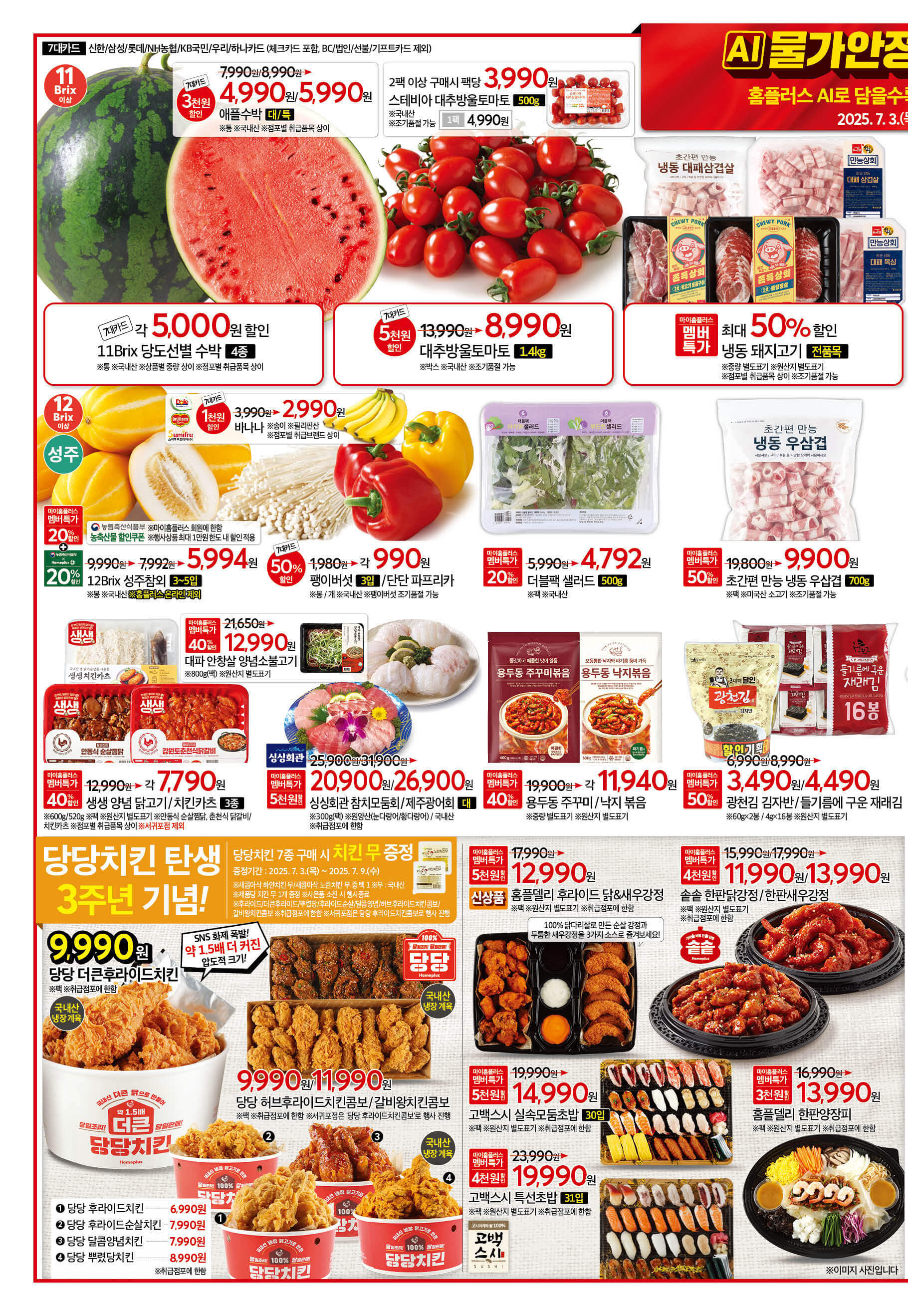 이번 홈플러스 전단광고 전단행사는 7월 3일(목)부터 9일(수)까지 단 일주일간 진행된다. 식재료, 생필품, 계절 가전 등 모든 품목을 아우르는 할인 행사라 여름철 꼭 필요한 수박, 체리, 제습기, 선풍기 등 인기 품목을 이번 기회에 챙기기에도 좋다. 일부 품목은 매장 상황에 따라서 행사 기간이 달라질 수 있으니 방문 전 확인은 필수이다.