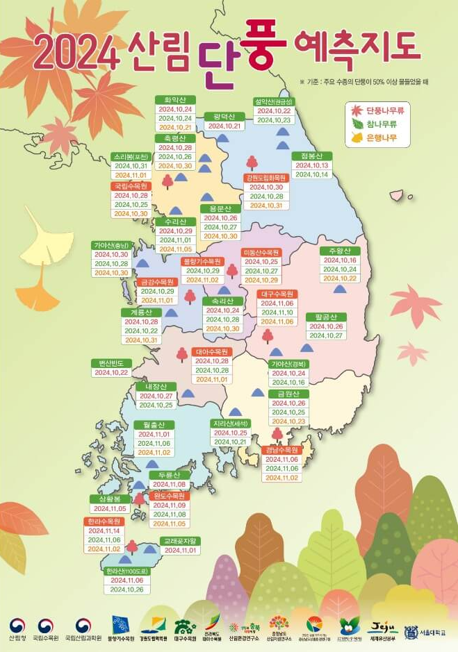 단, 보통 10월 말 정도가 되면 산림의 80%가량이 단풍으로 물이 들어왔었는데 앞서 말했듯이 늦더위의 여파로 이 시기에는 50% 정도 수준에 그칠 것으로 예상되며 지역에 따라서도 차이가 있겠지만 산림의 80%가 단풍으로 물드는 최절정시기는 11월 초로 보고 있다.