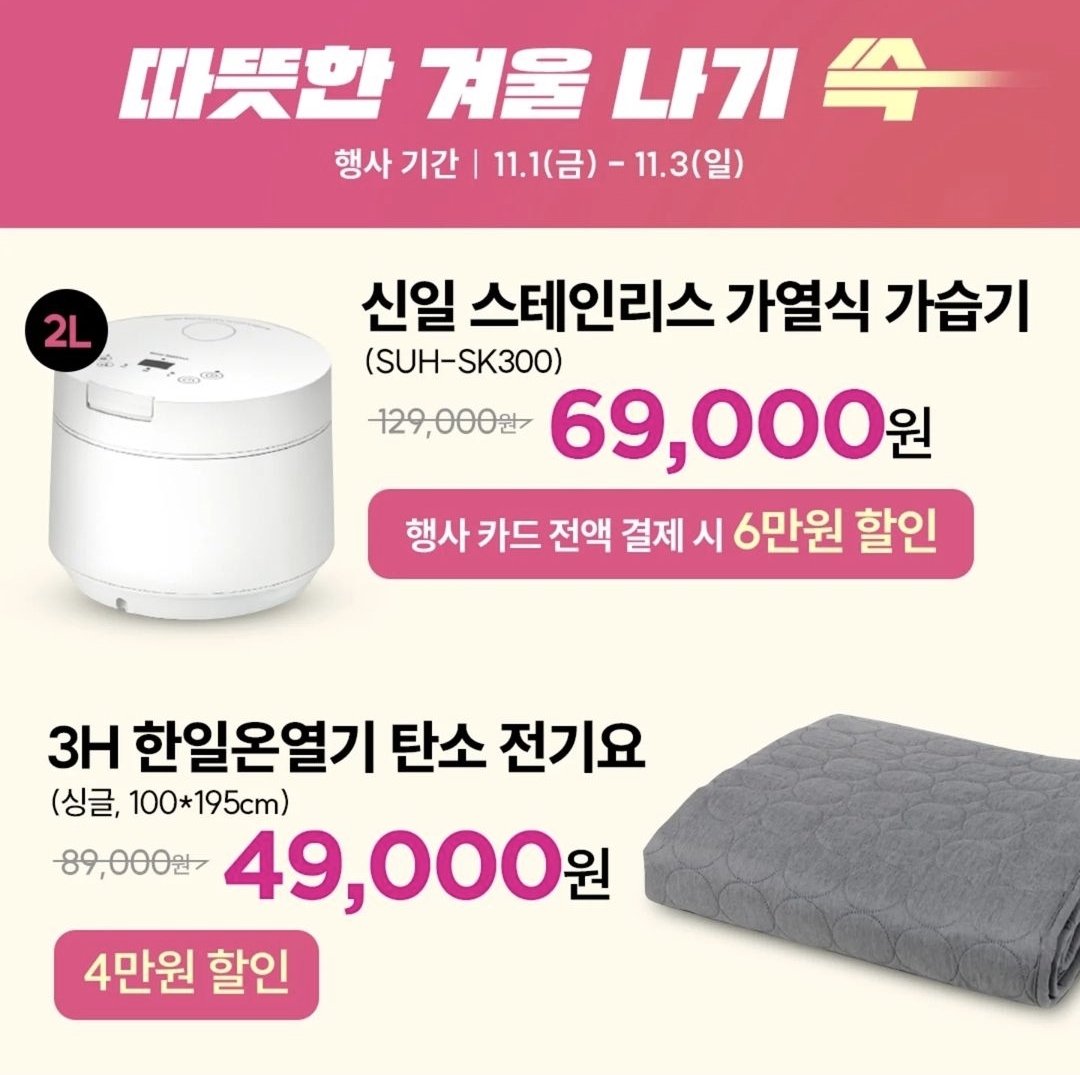 이마트에서는 쓱데이를 맞이하여 더 알차게 즐길수있는 쇼핑 큐레이션을 제공하고 있다. 이마트 쓱데이 기간 동안 2개를 50% 할인하는 생필품부터 놓치기 쉬운 할인템과 겨울 시즌 방한 꿀템까지 반값에 구매할 수 있으니까 특히 올리브오일과 탄소 전기요 그리고 가열식 가습기는 놓치지 않았으면 좋겠다.