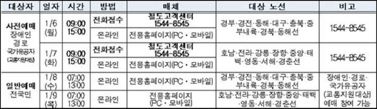 * 사전예매(장애인, 경로, 국가유공자) 1월 7일(화) 오전 9시부터 오후 3시까지 호남, 전라, 강릉, 장항, 중앙, 태백, 영동, 서해, 경춘선 열차 예매 가능