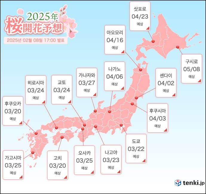 이는 2025년 2월 8일 오후 5시에 발표된 2025년 일본 벚꽃 개화시기로 일주일가량 오차가 생길수도있으니 참고하자.