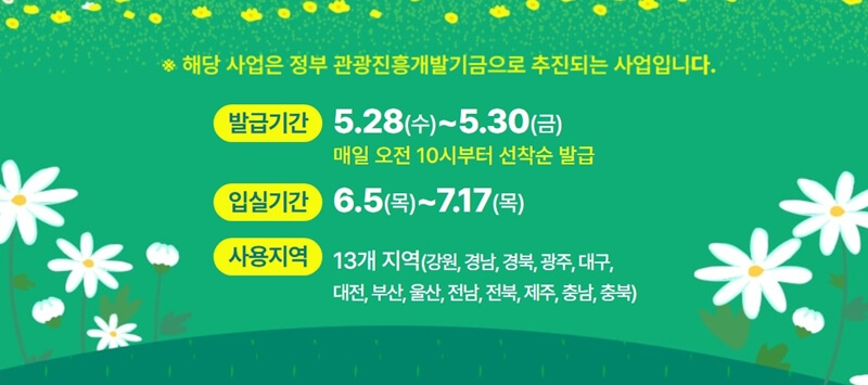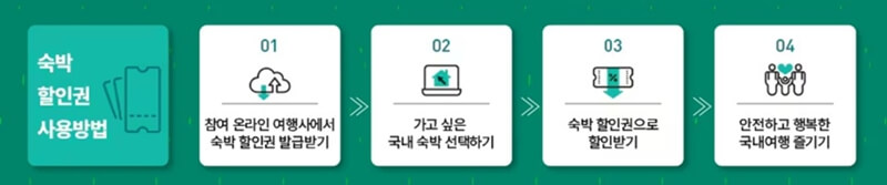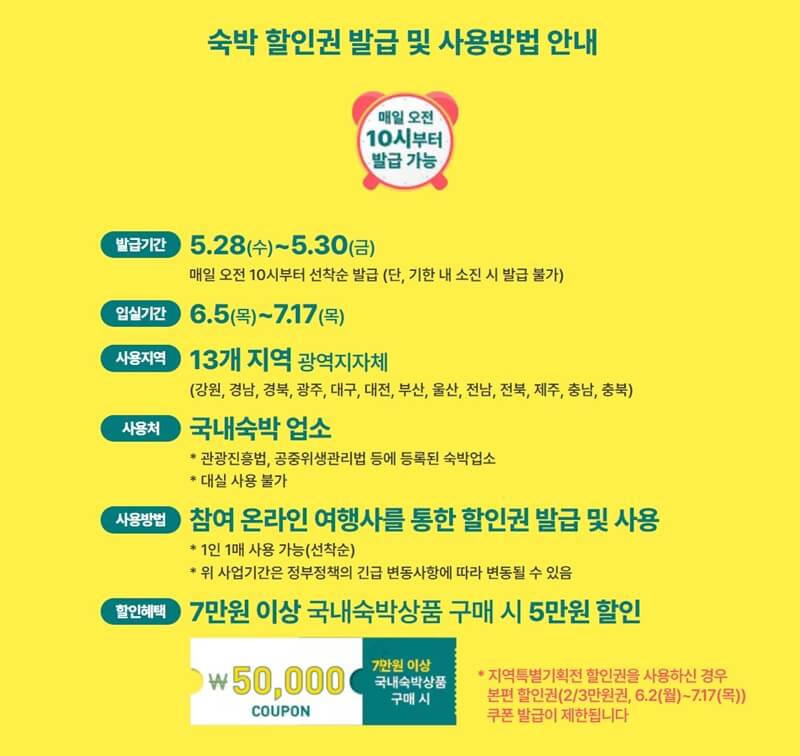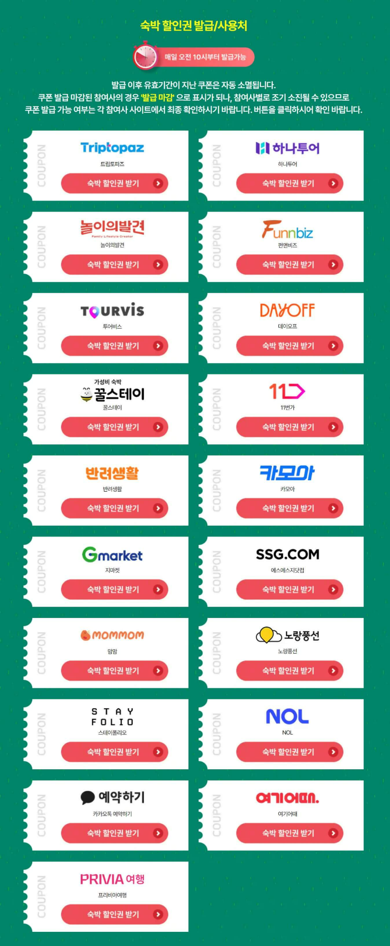 숙박 할인권 발급처는 노랑풍선, 여기 어때, 프리비아여행, 꿀스테이, 데이오프, 펀 앤 비즈, 스테이폴리오, 맘맘, 11번가, 트립토파즈, 카카오톡예약하기, 반려생활, 투어비스, 놀이의 발견, NOL, 카모아, 에스에스지닷컴, 지마켓, 하나투어 등이 참여하기 때문에 평소에 내가 이용해 왔던 사이트에서 발급받으면 된다.