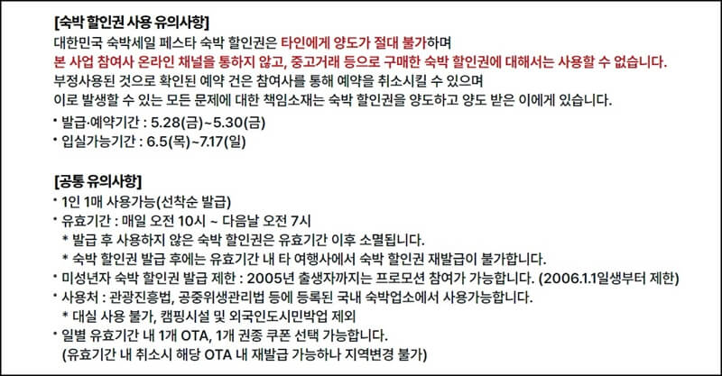 숙박 세일 페스타 5만 원 할인쿠폰은 타인에게 양도가 절대 불가능하고 해당 이벤트에 참여하는 온라인 채널을 통하지 않고 중고거래 등으로 구매한 숙박 할인권은 사용할 수 없으니 주의하자. 그리고 발급받은 쿠폰을 해당 기간에 사용하지 않은 경우에는 자동적으로 소멸되며 미성년자 숙박 할인권 발급은 제한되니 참고하자.