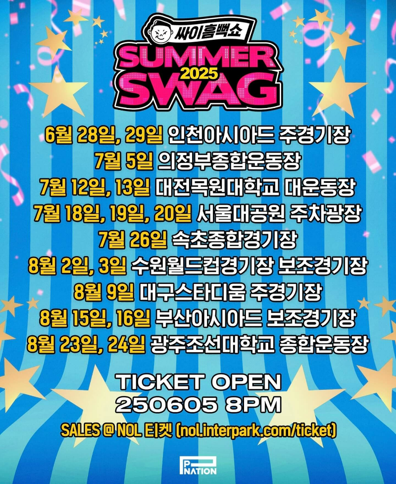 싸이 흠뻑쇼 SUMMER SWAG 2023은 전국 9개 도시에서 진행된다고 한다. 그리고 어제인 25일 공식 SNS 계정에 싸이 흠뻑쇼 투어 일정이 담긴 포스터를 공개했는데 9개 도시는 어디인지와 함께 싸이 흠뻑