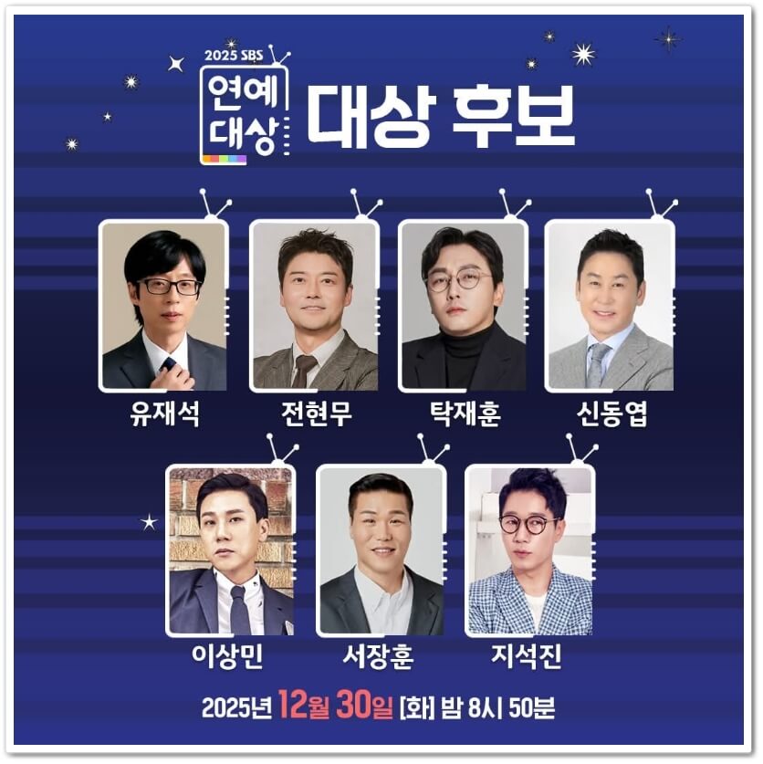 2025 SBS 연예대상 후보 7인 완벽 정리! 12월 30일 방송 일정, 시청 방법, 인기 프로그램 투표까지 한눈에 확인하세요.