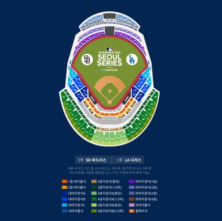 mlb 서울 개막전 티켓 가격을 보면 사람들이 많이 선호하는 내야 지정석이 40만 ~ 50만원으로 형성되어 있다. 그리고 야 지정석이 12만 ~ 18만 원으로 형성되어 있고, 외야 스텐딩석이 12만 원인데 꽤 비싸긴 한 것 같다. 3루 쪽이 SD 파드리스이고 1루 쪽이 LA 다저스이니까 이런 부분 잘 참고해서 예매하면 될 것 같다. 티켓 오픈 하자마자 그냥 아무 좌석이나 눌러야 할 것 같지만...