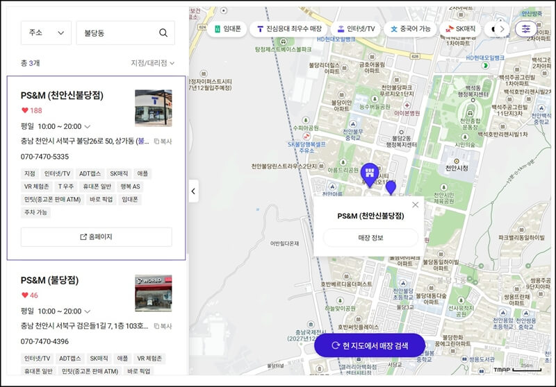 sk 유심 교체 매장 찾기로 들어가서 검색창에 거주하고 있는 동을 입력하면 유심 교체가 가능한 sk 공식 대리점들이 뜨고, 이 페이지에서 영업시간과 주소, 연락처까지 확인 가능하니까 미리 전화해서 재고 파악을 하고 방문하는 것이 좋다.