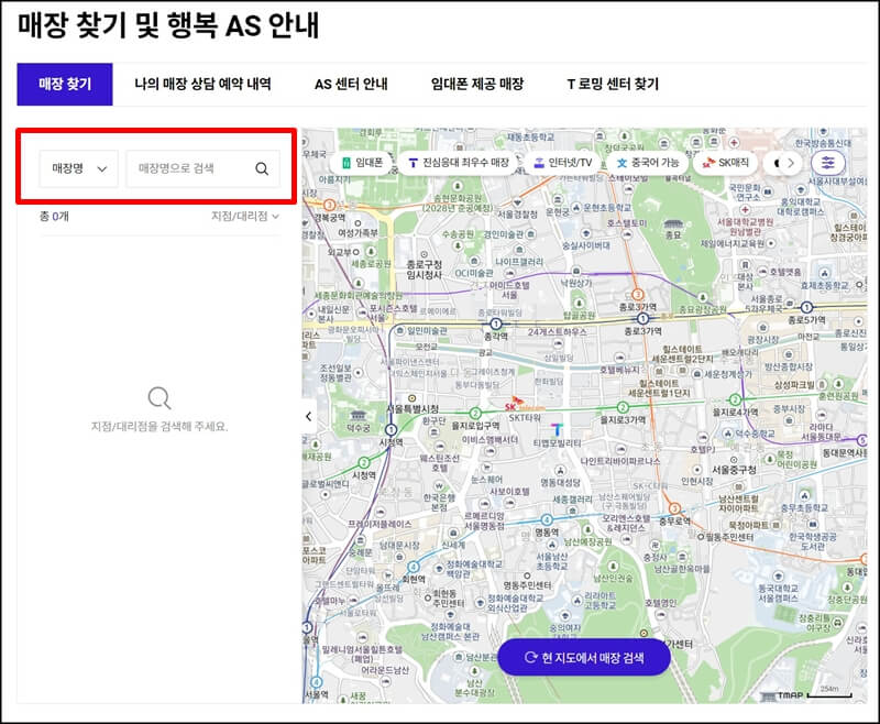 sk 유심 교체 매장 찾기로 들어가서 검색창에 거주하고 있는 동을 입력하면 유심 교체가 가능한 sk 공식 대리점들이 뜨고, 이 페이지에서 영업시간과 주소, 연락처까지 확인 가능하니까 미리 전화해서 재고 파악을 하고 방문하는 것이 좋다.