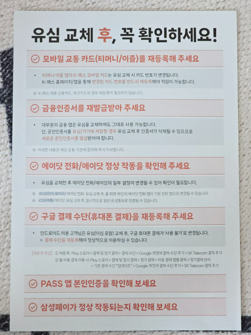 그리고 에이닷 전화를 사용해 왔다면 유심 교체 후 홈 화면 하단의 전화앱이 기본 전화 앱으로 변경될 수도 있고, 구글 휴대폰 결제가 사용불가로 변경되기 때문에 구글 결제 수단 또한 재등록해야 정상적으로 이용이 가능하다. PASS 앱과 삼성페이가 정상 작동되는지도 확인하는 것이 좋다.