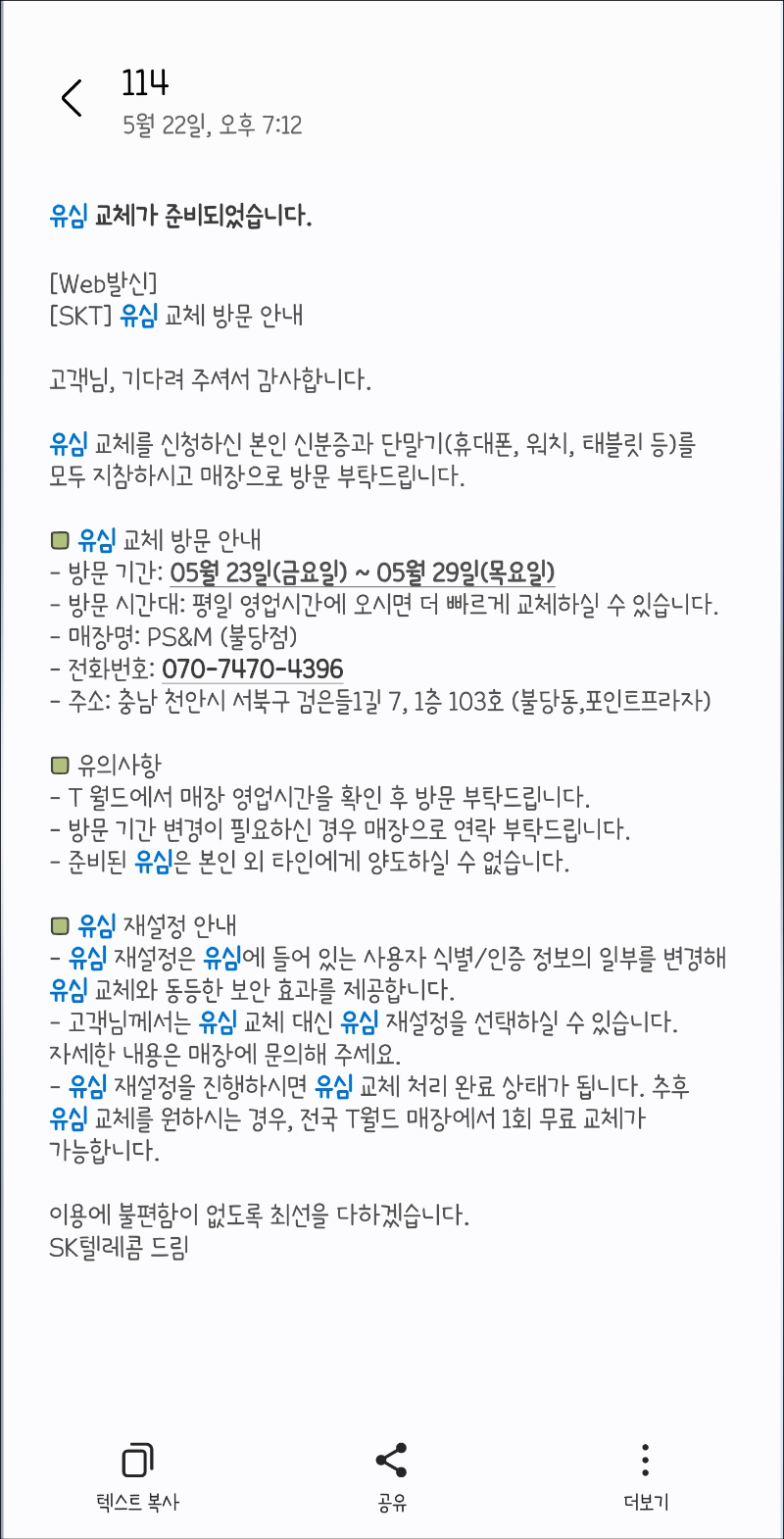 sk 유심 교체 온라인 예약 페이지에서 본인인증 > 매장선택 > 예약 확인 > 신청 완료 순으로 교체 예약을 진행하고 나면 해당 매장에서 예약이 완료되었다는 문자가 발송되고, 교체할 유심이 준비되면 해당 매장에서 언제까지 방문하라고 문자가 또 한 번 발송된다. 필자는 유심 교체 신청 후 2주 지나고 나서 유심 교체가 준비되었다는 문자를 받았고, 다음날 바로 방문하여 교체를 진행했다.