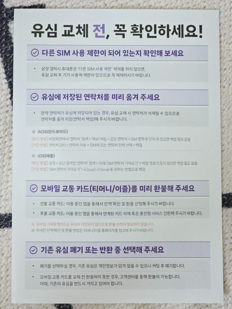 일단 sk 유심 교체 전후로 주의할 사항이 몇 가지 있다. 교체하기 전에는 꼭 핸드폰 설정에서 다른 SIM 사용 제한을 비활성화해두는 것이 좋고(대부분 비활성화되어있는데 이번 사태로 사용 제한 걸어놓은 분들 있음), 혹시 모를 상황에 대비해서 연락처가 유심에 저장되어 있는지도 확인하는 것이 좋다. 그리고 티머니와 이즐같은 모바일 교통카드를 사용하는 분들은 미리 환불 신청을 해야 한다.