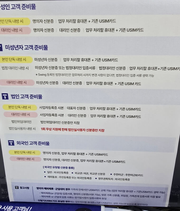 sk 유심 교체하러 대리점에 방문할 때는 신분증을 꼭 챙겨서 방문해야하는데 이는 교체하는 고객에 따라서 준비물이 달라진다.