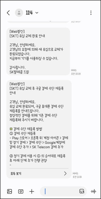 유심 교체가 완료되고 나면 유심 교체 완료 문자 메시지와 구글 핸드폰 결제 수단 재등록 안내 문자가 발송된다. 구글 핸드폰 결제는 재등록해야 했고, 삼성페이도 처음에 비번 등록은 다시 진행해야 했지만 삼성페이는 비번 등록만 하면 기존에 저장해 둔 카드들은 그대로 사용이 가능했다. 유심 교체를 할 때는 핸드폰이 켜있는 상태에서 그냥 진행해서 그런지 2~3분 정도 걸린 느낌이다.