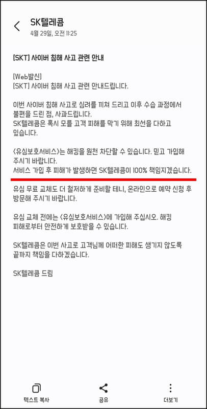 그리고 skt 유심보호서비스 가입을 해야하는 이유가 또 하나 있다. 이번 사태가 발생한 뒤 sk텔레콤에서는 고객들에게 사이버 침해 사고에 대한 관련 문자를 보냈다. 이 문자 내용을 자세히 보면 유심보호서비스는 해킹을 원천 차단할수있으니 믿고 가입해달라고 하면서 서비스 가입 후 피해가 발생하면 자사가 100% 책임지겠다고 한다. 즉, 서비스에 가입을 하지 않은 상태에서 피해가 발생할 경우에는 책임을 지지 않는다는 말이 될수도 있기 때문에 skt를 사용하는 분들은 무조건 skt 유심보호서비스 가입을 해놓는것이 좋다.