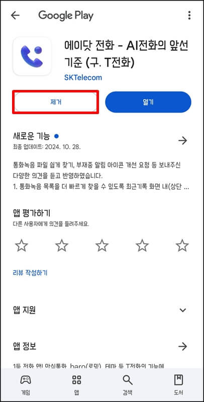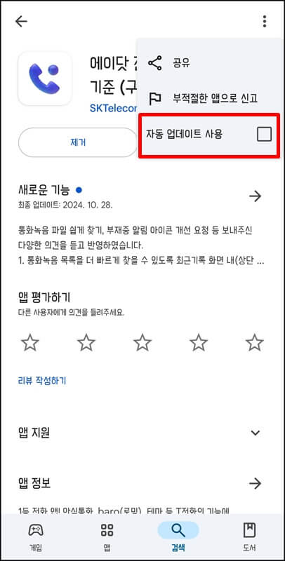 그렇게 에이닷전화 삭제를 진행했다고 하더라도 해당앱의 자동업데이트를 해제해놓아야 나중에도 자동업데이트가 되지 않고 계속해서 t전화를 사용할 수 있다. (구글플레이 또는 앱스토어에서 에이닷전화 검색 후 상단점 세 개 누르고 자동업데이트 사용 체크 해제)